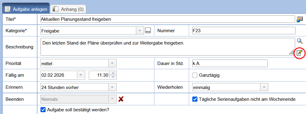Tragen Sie alle Angaben zur neuen Aufgabe ein. Wenn Sie die Checkbox Aufgabe soll bestätigt werden anklicken, sieht die Empfangsperson der Aufgabe eine Markierung, über die Sie die Aufgabe bestätigen, absagen oder unter Vorbehalt zusagen kann. Siehe hierzu Kapitel Aufgabe bestätigen.