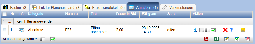 Die neue Aufgabe wird in der Eigenschaftenseite in der Tabelle Aufgaben angezeigt.