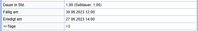 Sobald eine Aufgabe beendet wird, wird die Differenz zwischen Fälligkeitsdatum und Datum der Fertigstellung ermittelt. Zur weiteren Information wird zusätzlich zur beim Beenden der Aufgabe angegebenen Dauer auch die beim Anlegen der Aufgabe angegebene Solldauer dargestellt.
