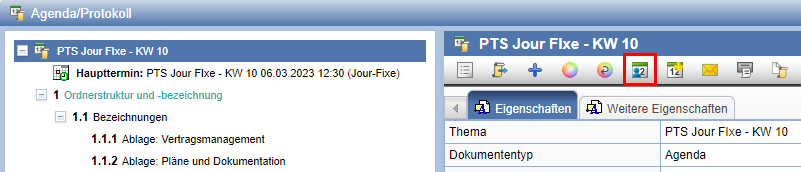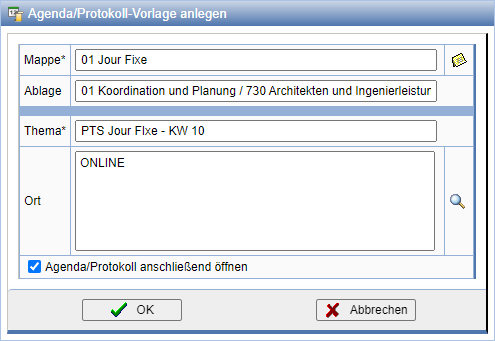 Eine Agenda bzw. ein Protokoll wird zu einem Termin, z.B. für eine Sitzung erstellt. Dies kann direkt bei der Erstellung eines neuen Termins durch die Option Agenda/Protokoll-Vorlage anlegen oder nachträglich bei einem bestehenden Termin erfolgen.