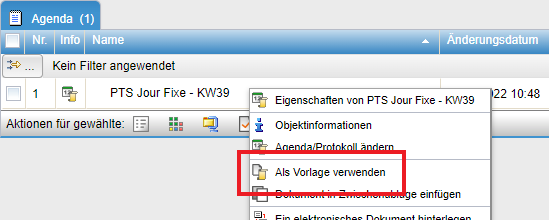 Ein bereits bestehendes Aufgabenprotokoll kann als Vorlage für ein neues Protokoll verwendet werden. Auf diese Weise kann z.B. das Neuerfassen der Agenda bei ähnlichen Terminabläufen vereinfacht oder ein bestehendes Protokoll bei Folgeterminen fortgeführt werden. Öffnen Sie hierfür das Kontextmenü des bestehenden Protokolls und wählen Sie die Aktion Als Vorlage verwenden.
