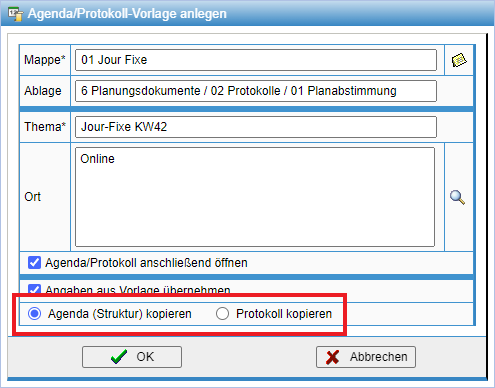 Beim Anlegen einer neuen Agenda bzw. eines neuen Protokolls können Sie entweder die Struktur übernehmen, also lediglich die Agendapunkte oder das gesamte Protokoll mit Aufgaben, Terminen und Feststellungen kopieren.