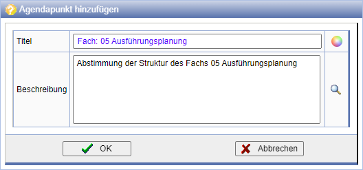 Zusätzlich kann die Farbe für den Agendapunkt festgelegt werden, um beispielsweise bei Fortschreibung des Protokolls