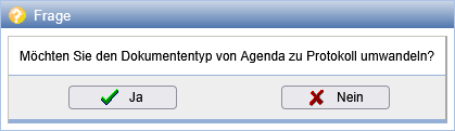 | Umwandlung des Dokumententyps (Agenda zu Protokoll oder umgekehrt). Aus dem aktuellen Dokumententyp leitet sich auch der Typ der erzeugten PDF ab. | |