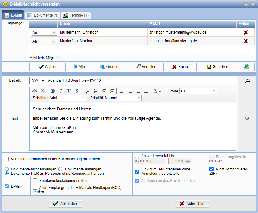 Es wird eine PDF-Datei erzeugt und parallel abgelegt. Anschließend wird der E-Mail-Dialog geöffnet Das PDF-Dokument wird als Anhang und die beteiligten Personen als Empfänger übernommen.