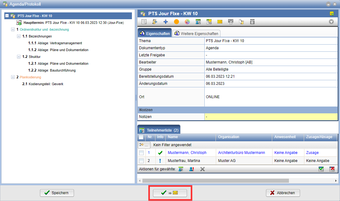 Nach der Erstellung kann die Agenda bzw. das Protokoll per E-Mail oder Nachricht an die beteiligten Personen verteilt werden. Hierzu wird die entsprechende Aktion im Protokolldialog gewählt.