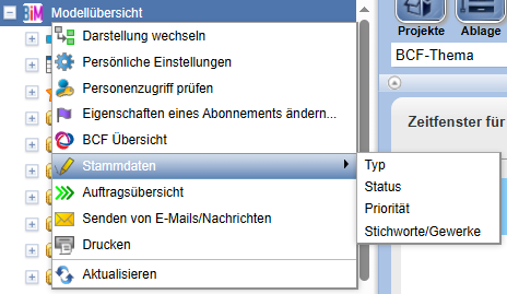 Im Dropdown-Menü des BCF-Manager, welches durch Wahl von geöffnet werden kann, stehen zusätzlich die folgenden Aktionen zur Verfügung: