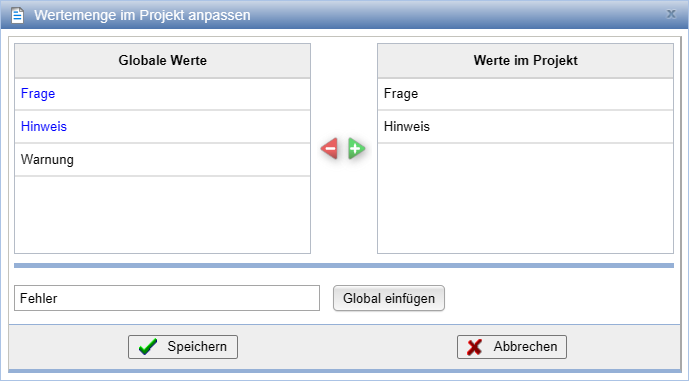 Im Dialog können global verfügbare Werte für das jeweilige Projekt ausgewählt werden. Zusätzlich können neue globale Werte definiert werden.