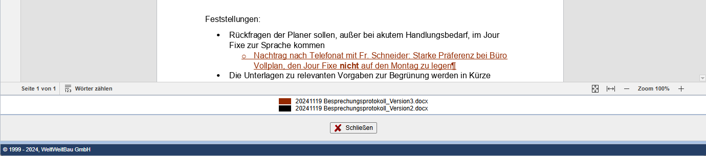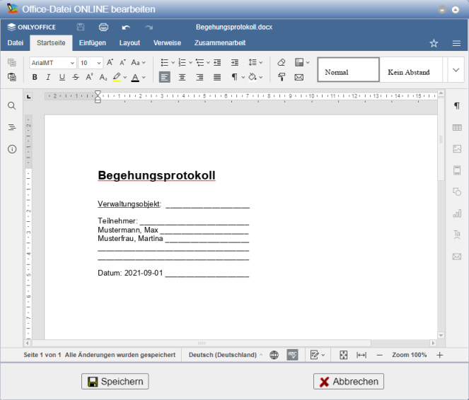 Das Dokument wird innerhalb des PlanTeam-SPACE zur Onlinebearbeitung geöffnet. Das Bearbeitungsfenster kann unabhängig vom PlanTeam-SPACE Fenster verschoben werden. Somit ist eine Bearbeitung auf einem zweiten Monitor möglich.
