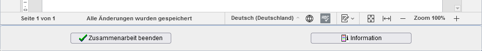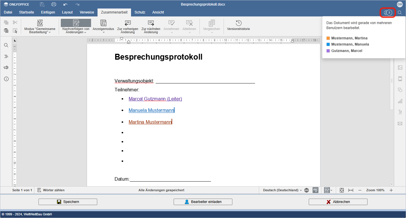 Ist das Nachverfolgen von Änderungen aktiviert, so werden die Änderungen der verschiedenen Bearbeiter in jeweils zugeordneten Farben hervorgehoben. Eine Übersicht der aktuellen Teilnehmer der gemeinsamen Bearbeitung sowie ihrer entsprechenden Farben kann über folgende Schaltfläche aufgerufen werden.
