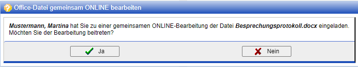 Zu diesem Zeitpunkt angemeldete und gewählte Nutzer erhalten nun eine Einladung. Andere gewählte Nutzer können auch ohne Einladung der Bearbeitung beitreten, indem sie beim entsprechenden Dokument selbst die Aktion zur gemeinsamen Bearbeitung betätigen.