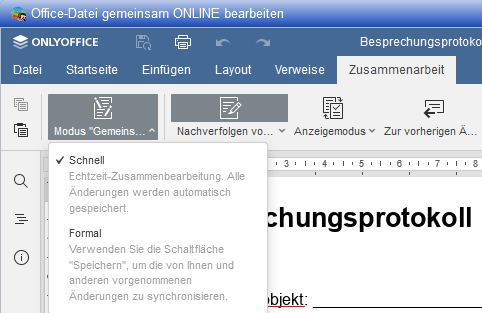 Im Modus Formal werden Ihre eigenen Änderungen anderen Nutzern erst dann angezeigt, wenn Sie Ihren Bearbeitungsstand per Speichern synchronisieren. Auch zwischenzeitliche Änderungen der anderen Nutzer werden Ihnen in Formal erst dann angezeigt.