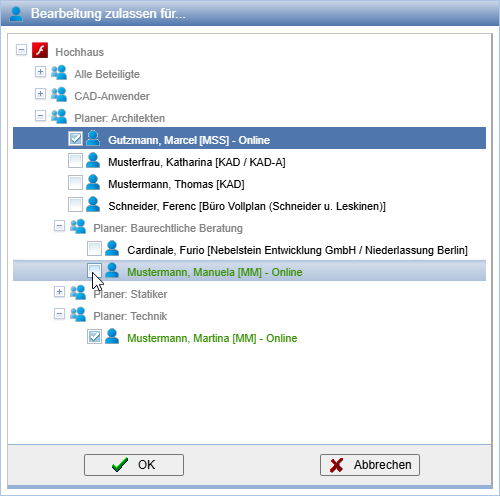 Anschließend können Sie die Mitglieder auswählen, mit denen das Dokument bearbeitet werden soll. Projektmitglieder, welche gerade online sind, werden hervorgehoben.