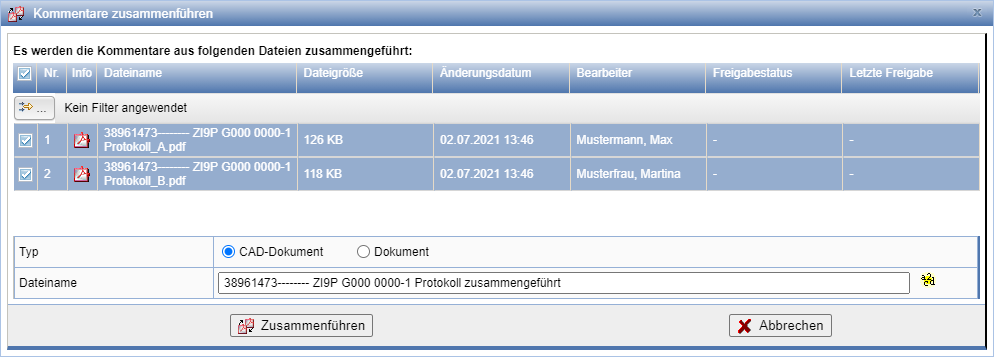 Daraufhin öffnet sich der Dialog zum Zusammenführen der Kommentare. Hier kann der Dokumententyp, Dateiname und ggf. der Ablageort festgelegt werden.