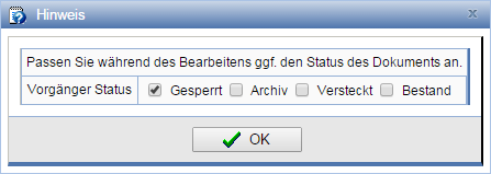 Anschließend werden Sie optional aufgefordert, den Status des Dokuments während der Bearbeitung anzupassen. Um beispielsweise zu verhindern, dass andere am Projekt beteiligte Personen das Dokument bearbeiten, oder herunterladen können, setzen Sie den Status auf gesperrt.