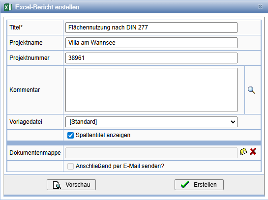 Über die Aktion in der Übersicht wird aus der Tabelle ein Excel-Bericht erstellt. Hier können Sie die Angaben zum Titel, Projektnamen usw. machen.