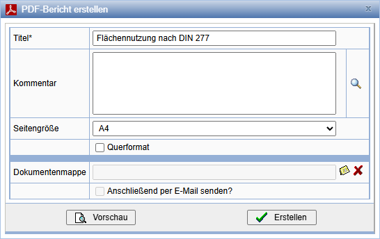 Über die Aktion in der Übersicht wird aus der Tabelle ein PDF-Bericht erstellt. Hier können Sie einen eigenen Titel, einen Kommentar sowie ein Format angeben.