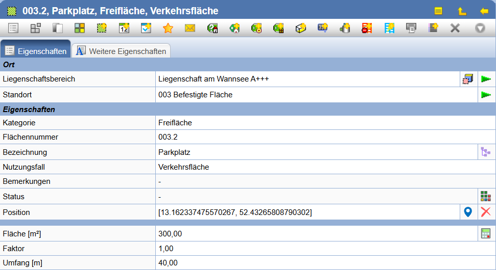 Durch Markieren eines Liegenschaftsbereiches im Baum wird die Eigenschaften-Seite geöffnet.