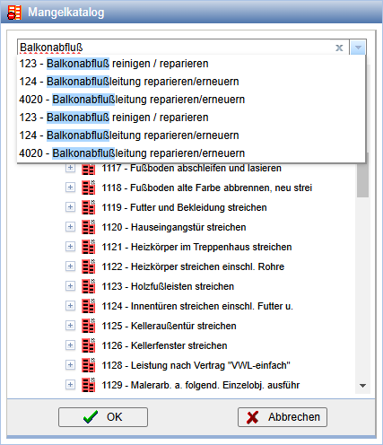 Bei der Auswahl von Mängeln und Störungen wird ein entsprechender Katalog bereitgestellt. Dieser beinhaltet ein Suchfeld, das die Suche nach bestimmten Mängeln und Störungen vereinfacht.