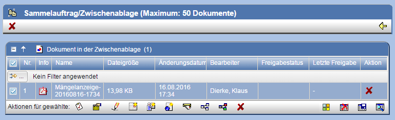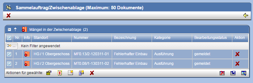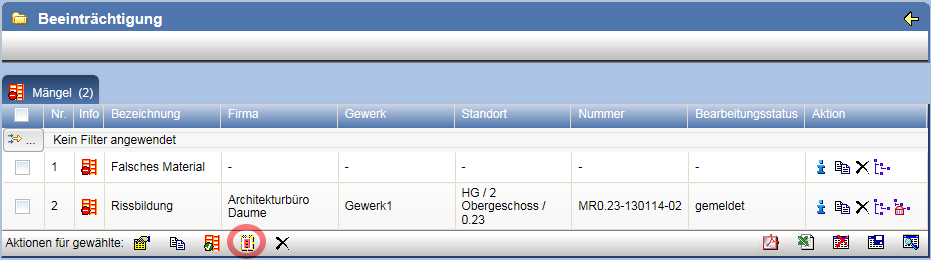 Checkboxen ausgewählt werden. Um für die gewählten Einträge eine Mängelanzeige zu erzeugen, betätigen Sie die Aktion