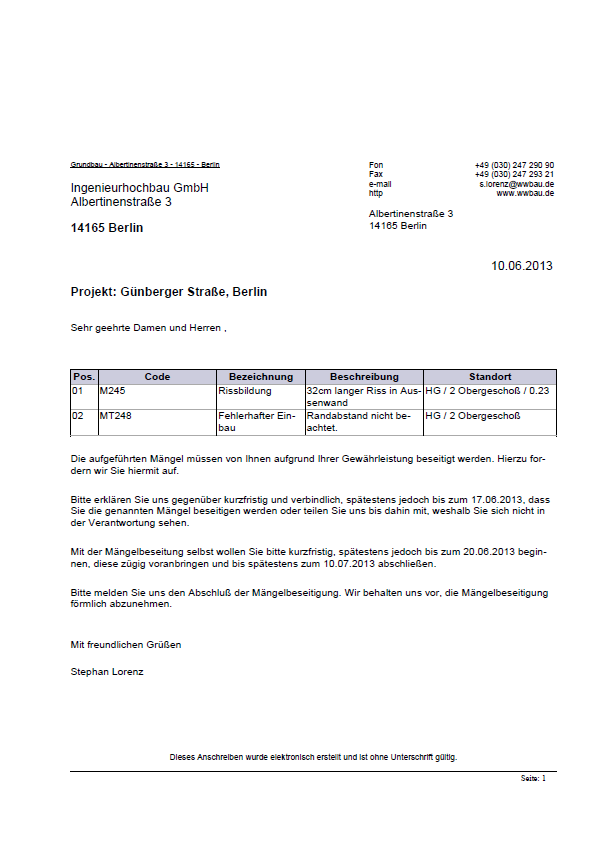im Ordner Mängelanzeigen in der Dokumentenmappe der ausführenden Firma abgelegt.