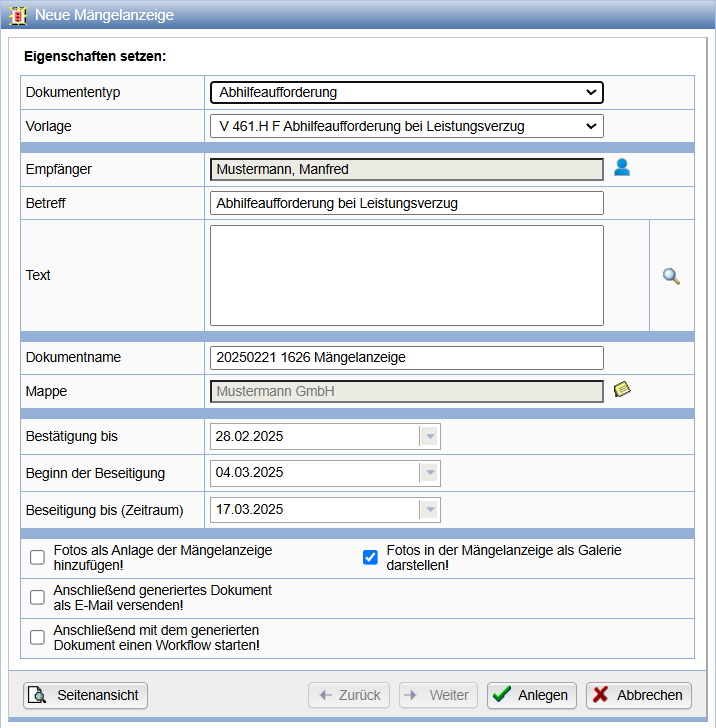 Drücken Sie abschließend Anlegen, um die Mängelanzeige zu erzeugen. Die Mängelanzeige wird als PDF-Dokument generiert und zur Voransicht in einem separaten Fenster angezeigt.